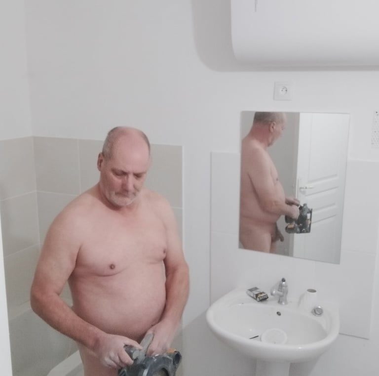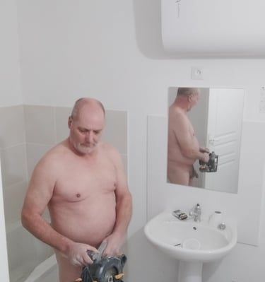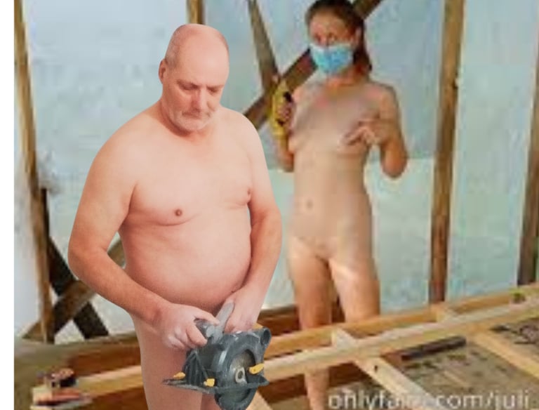 Bricolage nu sur site, encadré avec sérieux et consentement clair.